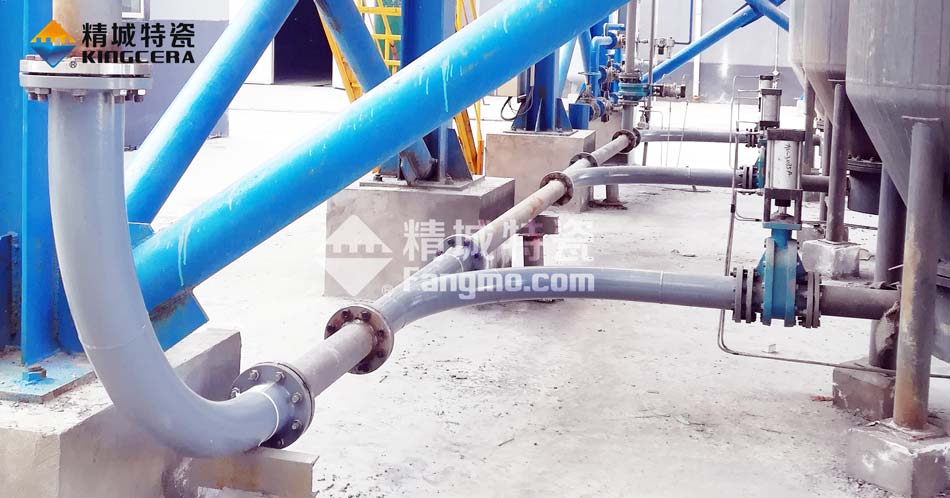 現(xiàn)如今使用精城牌耐磨陶瓷片作為內襯材料,優(yōu)點突出,耐磨陶瓷片本身硬度高,韌性強,很規(guī)則,每小塊之間用膠粘接,每一圈陶瓷片都進行錯位粘貼,做到無縫隙,杜絕瓷片間縫隙處被磨漏。管件之間的對接采用法蘭連接,便于安裝和更換,現(xiàn)已取得了良好的效果。