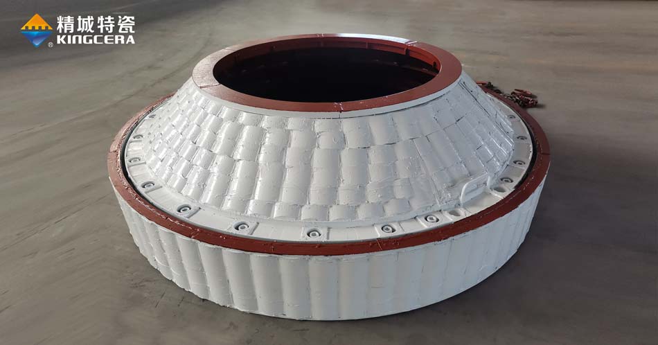 針對磨損如此嚴重的運行工況,我們推薦采用燕尾陶瓷異形結構復合襯板防磨。具體是將燕尾形陶瓷固定到立磨鋼結構上,耐磨陶瓷與鋼板間用耐高溫無機粘膠填充,陶瓷之間為零縫隙設計,360°錯位粘接固定工藝,縫隙相互錯開,表面光滑,可靠性大大增強,可抗沖擊,可以有效保證輥套的使用壽命延長10倍。