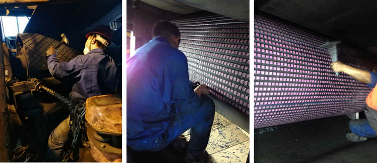 公司項目經理和施工隊長隨同客戶考察現(xiàn)場后發(fā)現(xiàn),陶瓷滾筒現(xiàn)場包膠工況非常復雜,施工難度相當大。包膠前需要拆除圍擋,起重錘,吊皮帶,去膠皮等;完成耐磨陶瓷滾筒包膠后,還需將滾筒現(xiàn)場恢復原樣。更關鍵是施工時間非常緊, 為不影響客戶生產,精城施工隊每24小時需要完成一個滾筒的包膠。