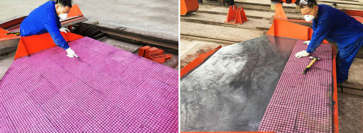 到現(xiàn)場后我們馬上開始了前期的勘察,工作環(huán)境不好,所有設(shè)備都裸露在車間內(nèi),吊車、重工設(shè)備來來往往,極為危險。準(zhǔn)備工作剛開始就遇到了一個難題:所有的設(shè)備都已經(jīng)涂滿了油漆。要想更好地安裝好耐磨陶瓷橡膠復(fù)合襯板,我們需要將表面所有油漆全部打磨掉,前期處理任務(wù)重、時間長。