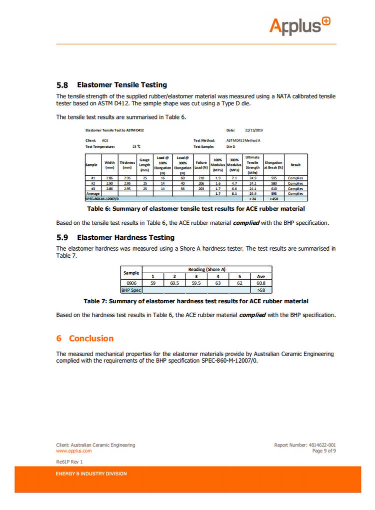 應(yīng)澳大利亞必和必拓鐵礦公司要求,澳大利亞國際測試機構(gòu)協(xié)會對湖南精城特種陶瓷有限公司生產(chǎn)的橡膠拉伸強度和硬度進形測試,該測試基于ASTM D412標準。經(jīng)測試,精城特瓷的橡膠性能完全符合甚至超過必和必拓鐵礦公司對耐磨陶瓷襯板的橡膠要求標準。