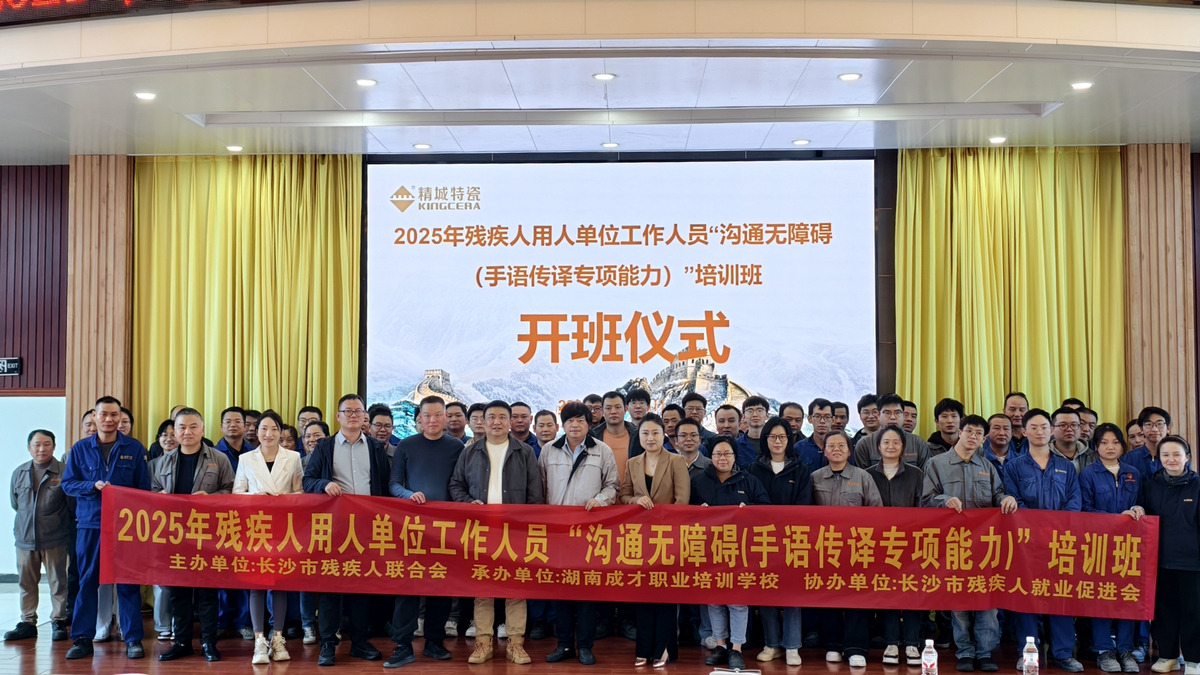 2025年10月23日下午,由長沙市殘疾人聯(lián)合會主辦、湖南成才職業(yè)培訓(xùn)學(xué)校承辦、長沙市殘疾人就業(yè)創(chuàng)業(yè)促進會協(xié)辦的2025年殘疾人用人單位工作人員“溝通無障礙”(手語傳譯專項能力)培訓(xùn)班,在湖南精城特種陶瓷有限公司辦公樓五樓會議室順利舉行開班儀式。公司總經(jīng)理楊政出席,人資部廖利娟主持儀式,與來自各單位的領(lǐng)導(dǎo)及參訓(xùn)學(xué)員共同見證了這一溫暖時刻。